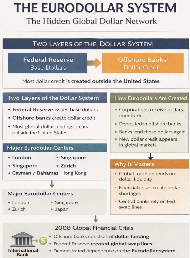 Because much of this activity occurs outside U.S. regulatory boundaries, the Eurodollar system introduces structural complexity into global financial stability.